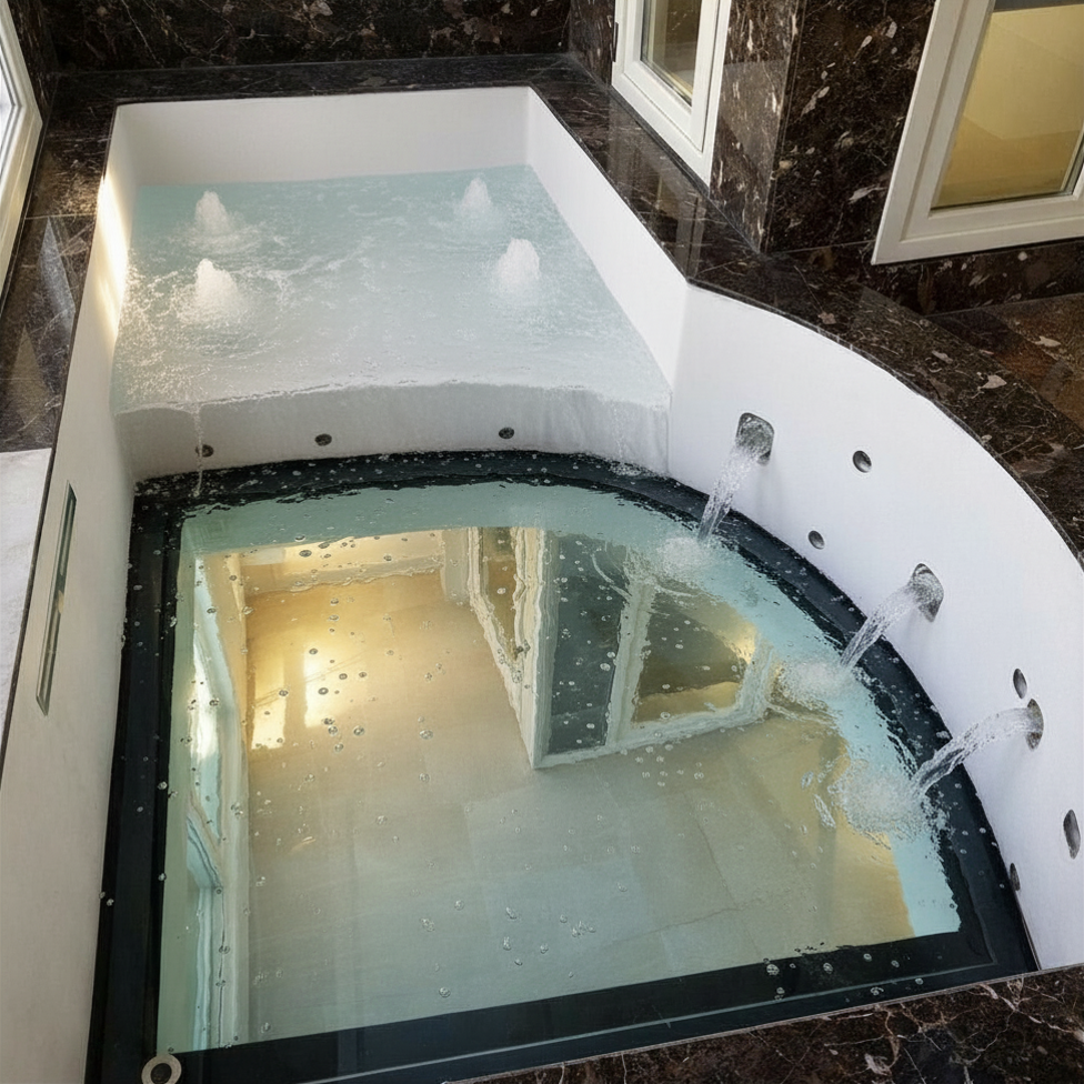 💡 Le saviez-vous ? Un jacuzzi de 2m² contenant 1000 litres d’eau exerce une pression de plus d’une tonne sur ses parois. Seul un verre feuilleté correctement dimensionné peut absorber cette charge en toute sécurité.